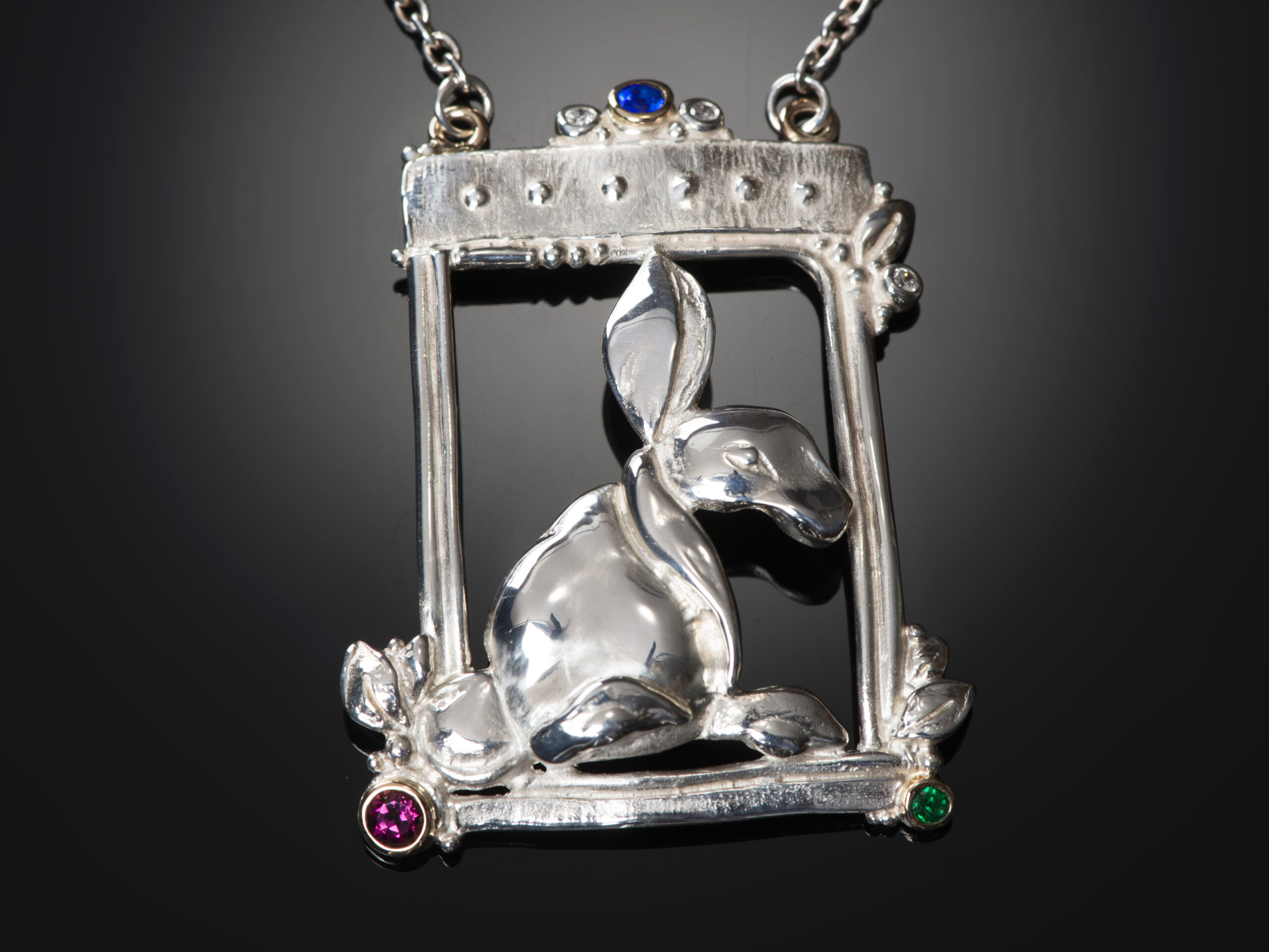 “Bunny Necklace” in Sterling Silver with 14K Yellow Gold Bezels, set with a Pink Tourmaline, a Blue Sapphire, a Tsavorite Garnet, and Natural Diamonds. 2″ Tall and 1 1/2″ Wide on 22″ Cable Chain.